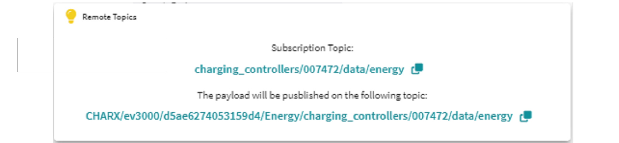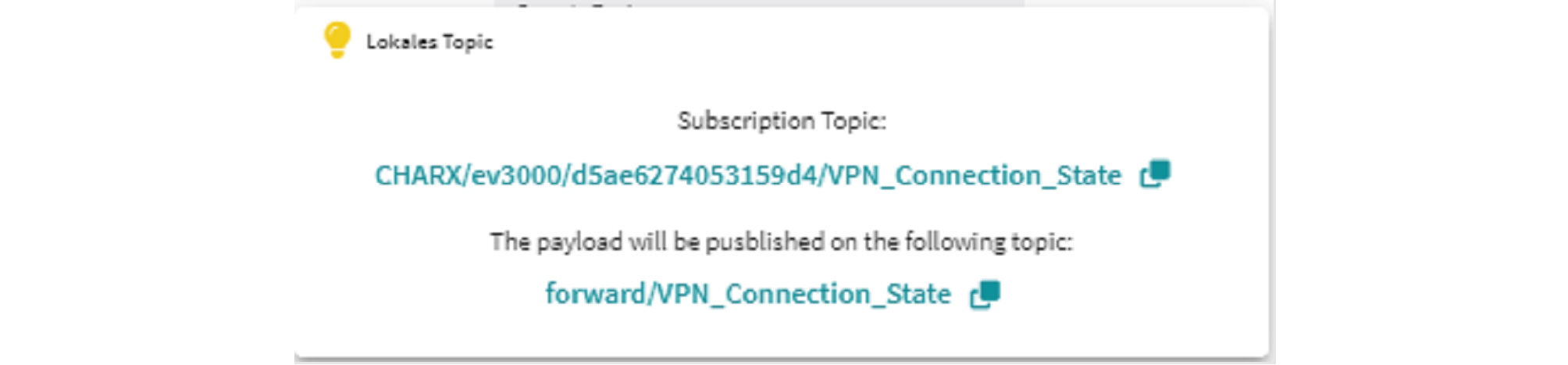 Opens a pop-up window that displays the topic under which the forwarded topic is published. The charging controller automatically adds the hierarchy <Prefix>, <Device type>, <Device ID> to the topic. You can copy the entire topic to the clipboard and use it for configuring the remote MQTT broker (“Information pop-up for forwarding topics from the MQTT bridge to the local MQTT broker” on page 127). |