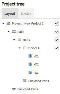 The Layout view depicts the physical structure of the project and provides an intuitive representation of the mechanical arrangement. When the user places a DIN rail, it appears directly in the Layout view in the project tree. If devices or items are then positioned on the DIN rail, they are displayed below the DIN rail – in the order in which they were placed, from the beginning to the end of the rail. This creates a clear, logically structured layout that reflects the actual mechanical arrangement.