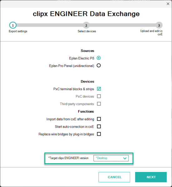 The Desktop option is now available in the drop-down menu. If Desktop is selected, the corresponding project is transferred directly to the clipx ENGINEER desktop application. To use this function, the current version of the clipx ENGINEER EPLAN interface and the desktop application are required.