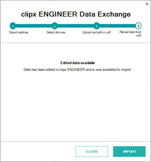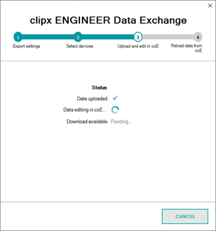 | Edit data in cxE | All selected devices are exported from the ECAD application and uploaded to cxE. The data exchange window remains open and displays the current status.