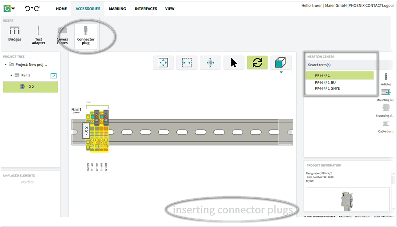 When you want to insert connector plugs, you have to activate the connector plug mode via the ribbon (ACCESSORIES > INSERT | Connector plug) or the radial menu. When you select the articles where you want to insert a connector plug, cxE filters the range of available articles for you and only displays the plugs that can be used in your case.