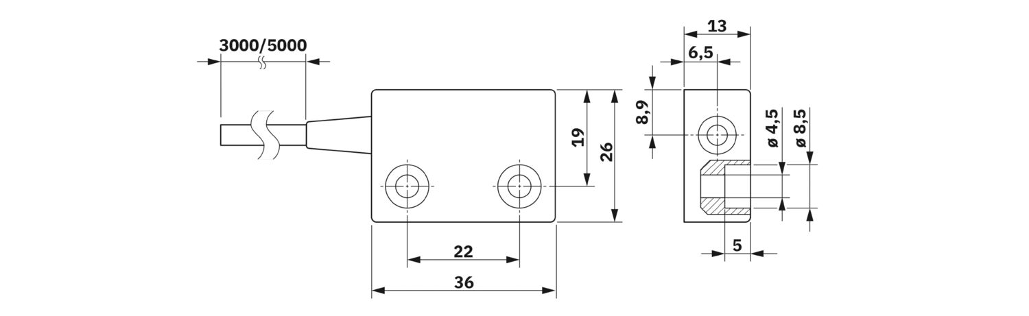 Non-contact safety switch, sensor, up to Cat. 4, PL e (EN ISO 13849), SIL 3 (EN IEC 62061), design 4 (EN ISO 14119), low encoding level, 1 N/O contact, 1 N/C contact, compact design, 3 m open PVC cable