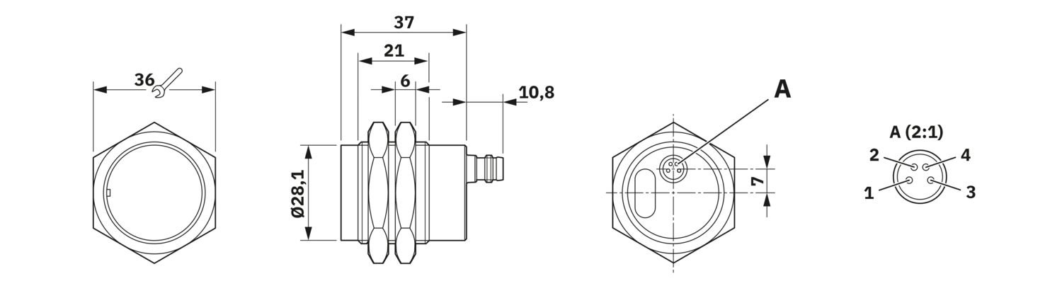 Non-contact safety switch, sensor, up to Cat. 4, PL e (EN ISO 13849), SIL 3 (EN IEC 62061), design 4 (EN ISO 14119), low encoding level, 1 N/O contact, 1 N/C contact, round design, 4-pos. M8 connector