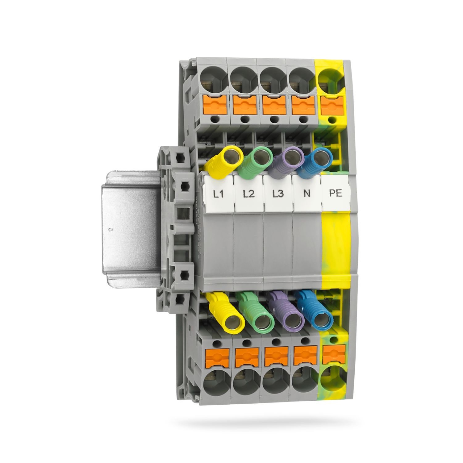 The preassembled transformer terminal block with N and PE connection measures voltage in a 3-phase system. The 3 phases and the N terminal block are color-coded with yellow (L1), green (L2), purple (L3) and blue (N).