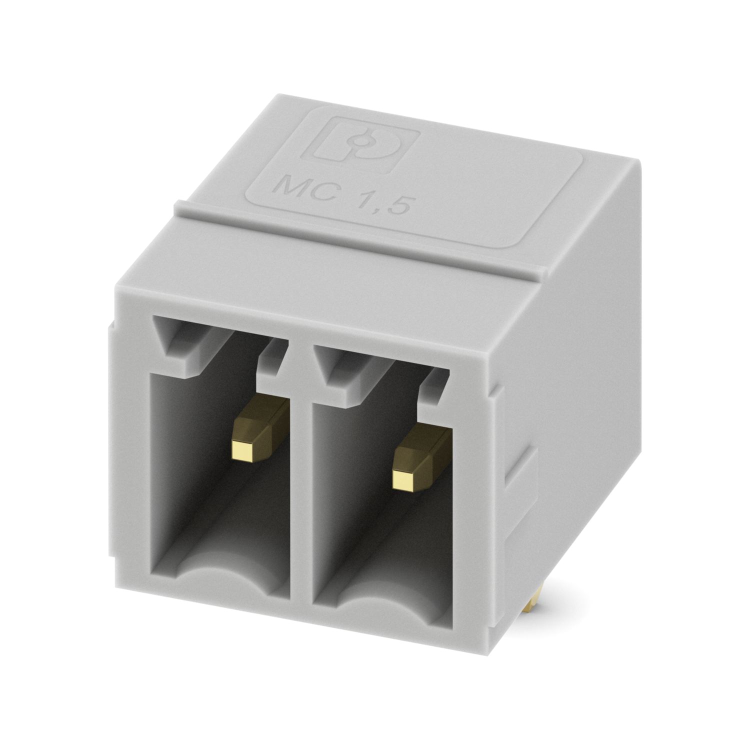 PCB headers, nominal cross section: 1.5 mm2, color: gray, nominal current: 8 A, rated voltage (III/2): 160 V, contact surface: Au, contact connection type: Pin, number of potentials: 2, number of rows: 1, number of positions: 2, number of connections: 2, product range: MC 1,5/..-G, pitch: 3.5 mm, mounting: Wave soldering, pin layout: Linear pinning, solder pin [P]: 3.4 mm, number of solder pins per potential: 1, plug-in system: COMBICON MC 1,5, Pin connector pattern alignment: Standard, locking: without, mounting method: without, type of packaging: packed in cardboard