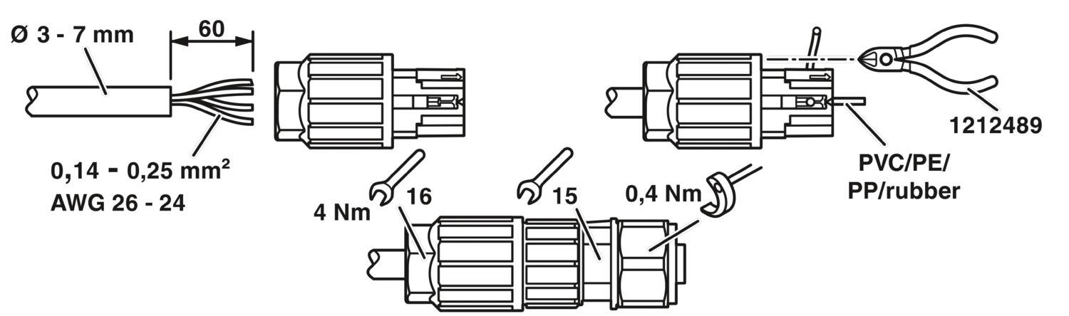 | Assembly note | NOTE: Observe the permissible bending radii when routing cables, since the degree of protection may be at risk if the bending forces are too high. Reduce mechanical loads upstream of the connector, e.g., by using cable ties. |