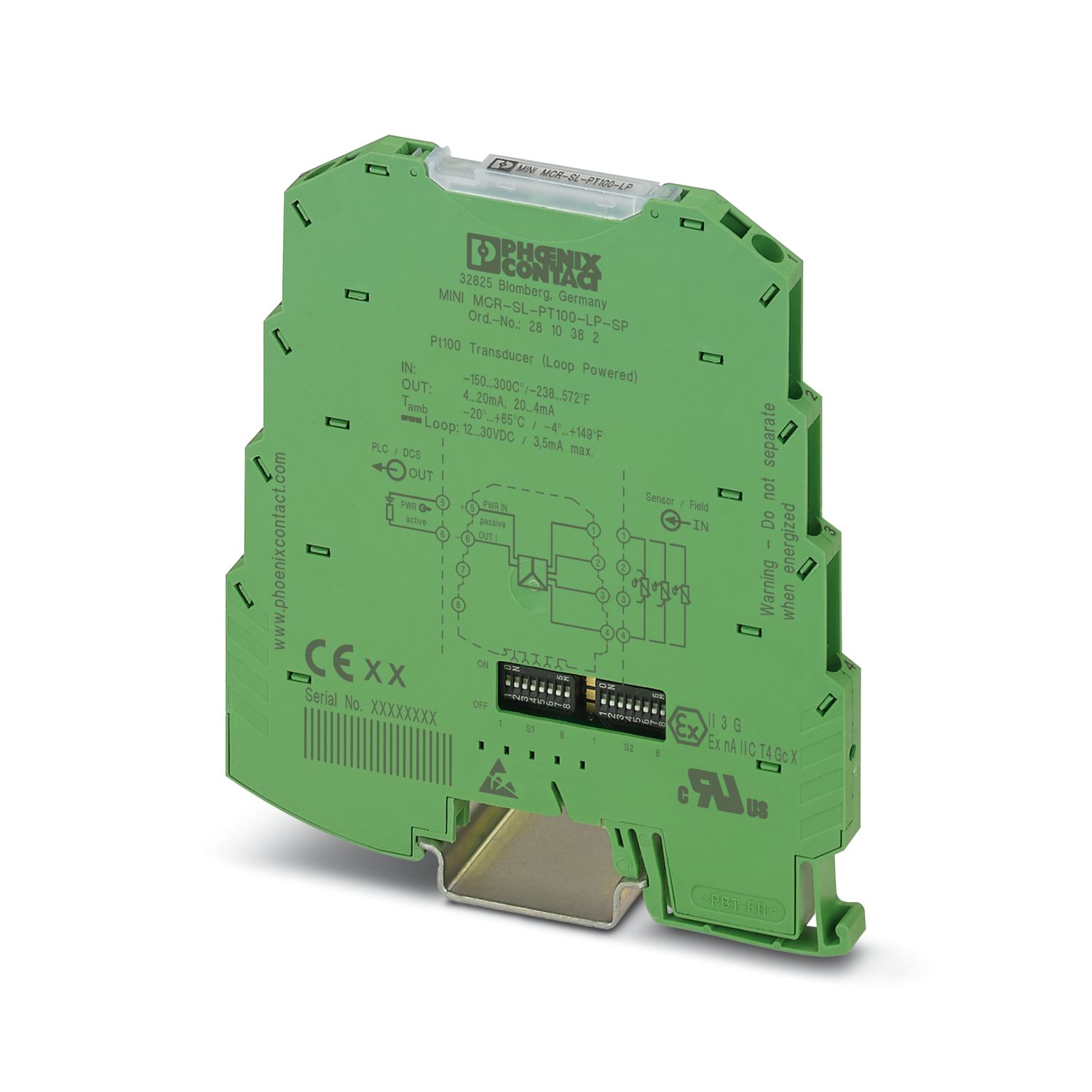 Loop-powered temperature transducer for Pt 100 temperature sensors, configured via DIP switches, with spring-cage connection, preconfigured (please observe the order key). Replacement part: 2810308 MINI MCR-SL-PT100-LP-NC.