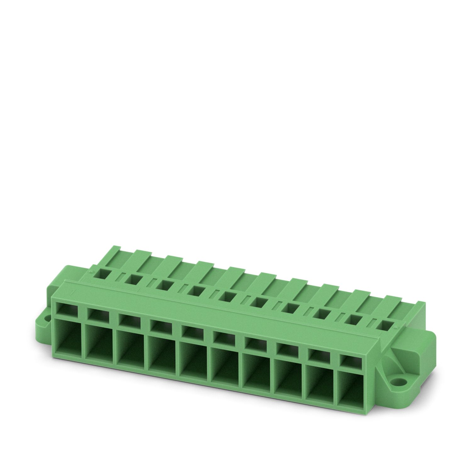 PCB connector, nominal cross section: 2.5 mm2, color: green, nominal current: 12 A, rated voltage (III/2): 320 V, contact surface: Sn, contact connection type: Pin, number of potentials: 10, number of rows: 1, number of positions: 10, number of connections: 10, product range: FKIC 2,5/..-STF, pitch: 5.08 mm, connection method: Push-in spring connection, conductor/PCB connection direction: 0 °, locking clip: - without locking clip, plug-in system: COMBICON MSTB 2,5, locking: Screw locking mechanism, mounting method: Screw flange, type of packaging: packed in cardboard