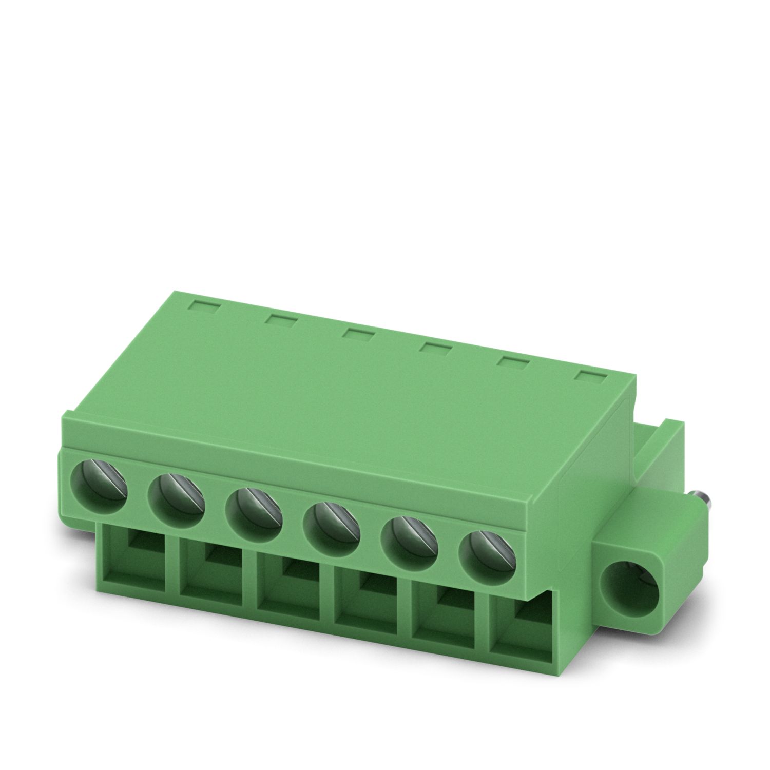PCB connector, nominal cross section: 2.5 mm2, color: green, nominal current: 12 A, rated voltage (III/2): 320 V, contact surface: Sn, contact connection type: Socket, number of potentials: 6, number of rows: 1, number of positions: 6, number of connections: 6, product range: FRONT-MSTB 2,5/..-STF, pitch: 5.08 mm, connection method: Front screw connection, screw head form: L Slotted, conductor/PCB connection direction: 0 °, locking clip: - Locking clip, plug-in system: COMBICON MSTB 2,5, locking: Screw locking mechanism, mounting method: Screw flange, type of packaging: packed in cardboard
