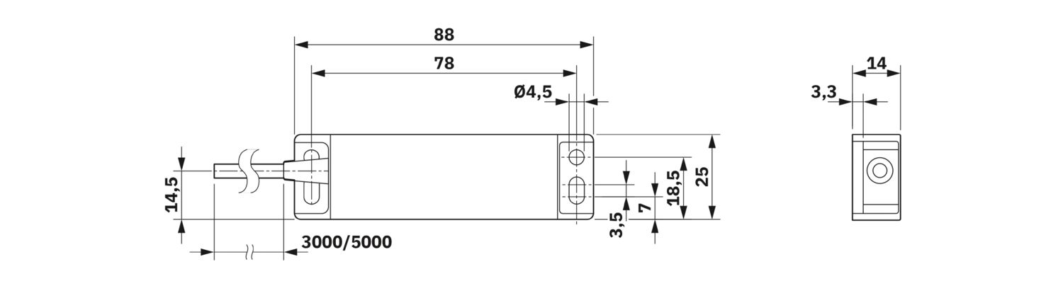 Interruptor de seguridad sin contacto, sensor, hasta categoría 4, PL e (EN ISO 13849), SIL 3 (EN IEC 62061), tipo de diseño 4 (EN ISO 14119), nivel de codificación bajo, 2 contactos NA, diseño plano, 5 m de cable de PVC abierto