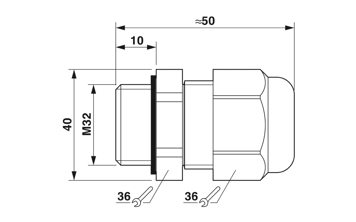 Prensaestopas de plástico hasta 5 bar, longitud de rosca: 10 mm, diámetro de cable: 15 - 21 mm, ancho entre caras 36, prensaestopas: M32