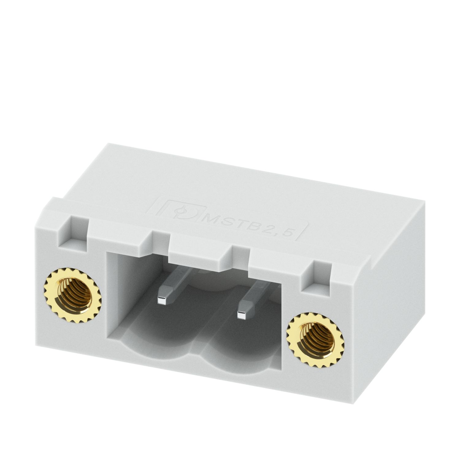 Embase de circuit imprimé, section nominale: 2,5 mm2, coloris: gris clair, intensité nominale: 12 A, tension de référence (III/2): 320 V, surface des contacts: Sn, type de contact: Mâle, nombre de potentiels: 2, nombre de rangées: 1, nombre de pôles: 2, nombre de connexions: 2, gamme d'articles: MSTB 2,5/..-GF, pas: 5,08 mm, montage: Soudage à la vague, plan des broches: Brochage linéaire, longueur de broche [P]: 3,23 mm, nombre de picots par potentiel: 1, système débrochable: COMBICON MSTB 2,5, Orientation du modèle d'enfichage: Standard, verrouillage: Verrouillage à vis, type de fixation: Bride filetée, type de conditionnement: emballé dans un carton
