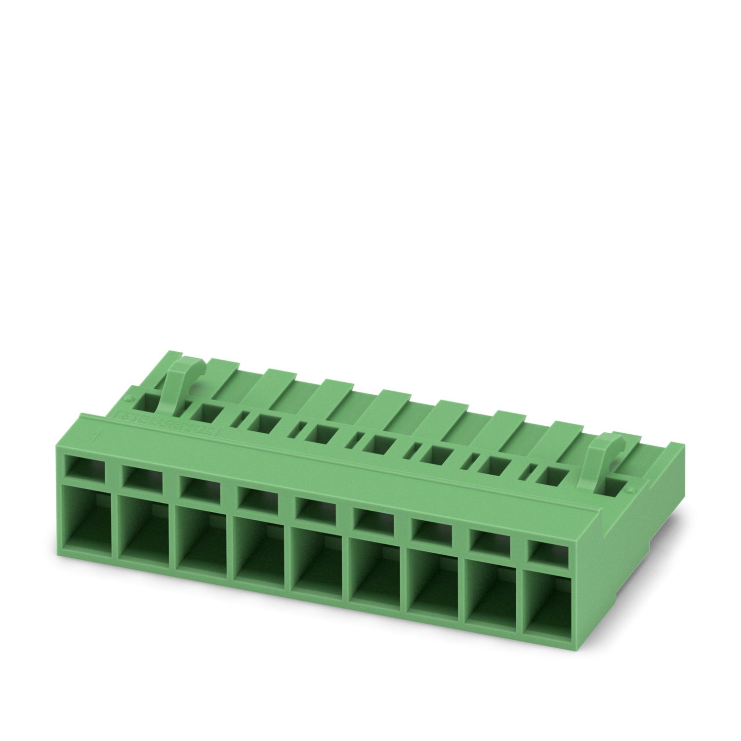 Embase traversante, section nominale: 2,5 mm2, coloris: vert, intensité nominale: 12 A, tension de référence (III/2): 320 V, surface des contacts: Sn, type de contact: Mâle, nombre de potentiels: 9, nombre de rangées: 1, nombre de pôles: 9, nombre de connexions: 9, gamme d'articles: DFK-MSTB 2,5/..-G, pas: 5,08 mm, type de raccordement: Connexion à souder/à languettes pour clips, montage: Montage direct, plan des broches: Brochage linéaire, longueur de broche [P]: 9,3 mm, nombre de picots par potentiel: 1, système débrochable: COMBICON MSTB 2,5, Orientation du modèle d'enfichage: Standard, verrouillage: sans, type de fixation: sans, type de conditionnement: emballé dans un carton, l'accessoire, réf. 5030172, est utilisable uniquement en association avec MSTB 2,5/...ST-5,08 et MSTBT 2,5/...ST-5,08.