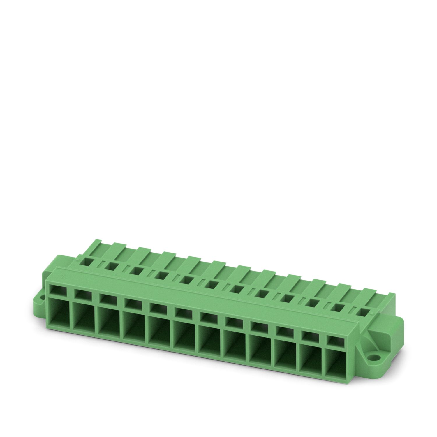 Connettore per circuiti stampati, sezione nominale: 2,5 mm2, colore: verde, corrente nominale: 12 A, tensione di dimensionamento (III/2): 320 V, superficie contatti: Sn, tipo di connessione del contatto: Spina, numero dei potenziali: 12, numero di file: 1, numero poli: 12, numero di connessioni: 12, serie di prodotti: IC 2,5/..-STF, passo: 5,08 mm, tipo di connessione: Connessione a vite con gabbia, forma di attacco delle viti: L Fessura longitudinale, direzione di collegamento conduttore/scheda: 0 °, gancio di bloccaggio: - senza gancio di bloccaggio, sistema di spine: COMBICON MSTB 2,5, bloccaggio: Bloccaggio a vite, tipo di fissaggio: Flangia a vite, tipo di confezione: confezionato nel cartone