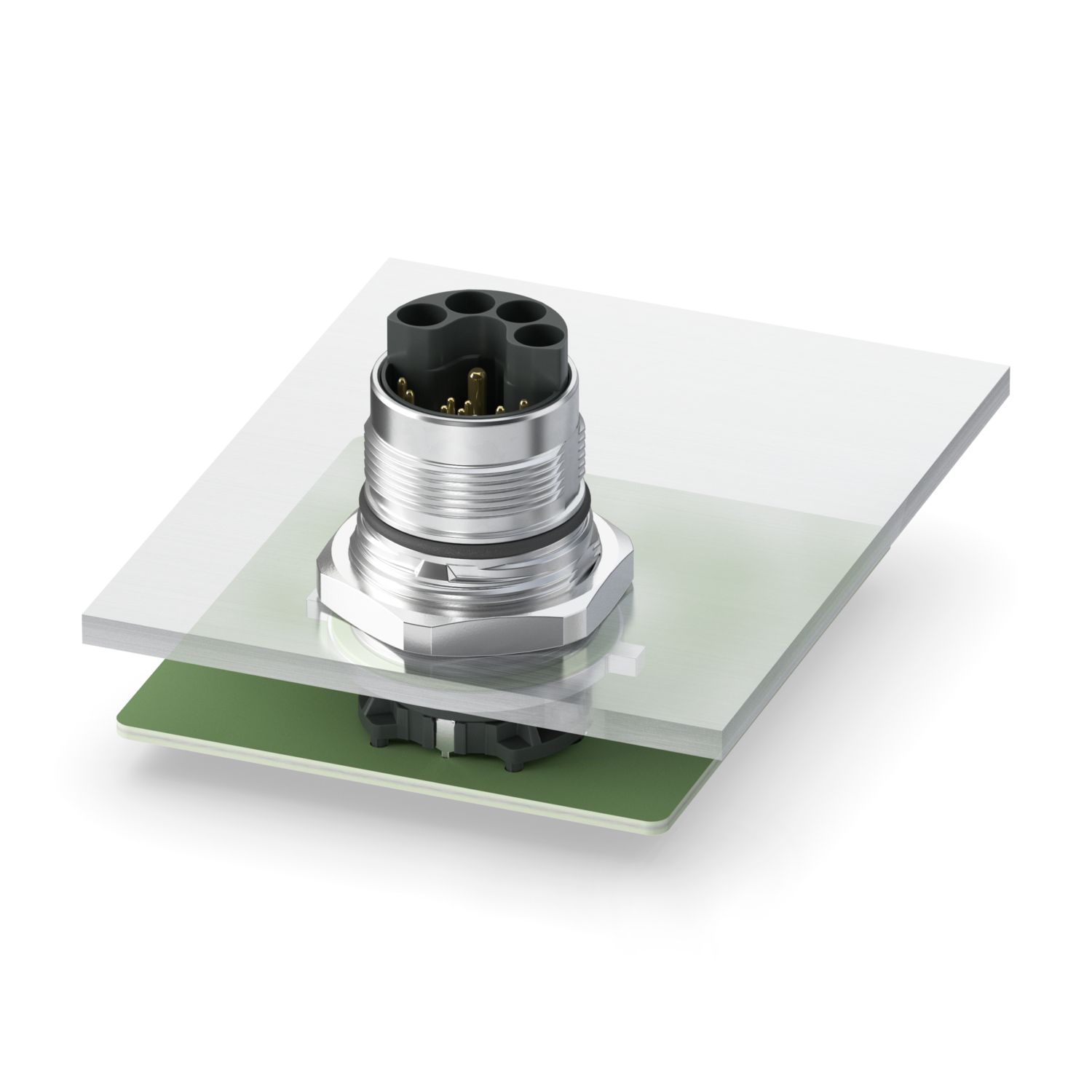 Il connettore a saldare M23 HYBRID ha una custodia robusta in pressofuso di zinco per il montaggio posteriore. La custodia è fissata con un controdado ed è dotata di una protezione antitorsione integrata.