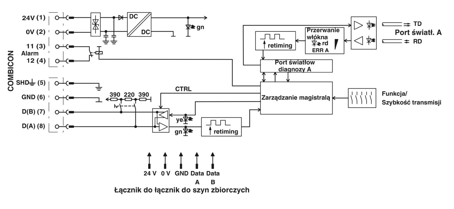 Konwerter światłowodowy ze zintegrowaną diagnostyką optyczną, styk alarmowy, dla przewodowych systemów magistrali RS-485 2- (SUCONET K, MODBUS ...) do 500 kBit/s, kodowanie NRZ, urządzenie końcowe z interfejsem (światłowodowym (SC dupleks), 1300 nm, dla kabla z włóknami szklanymi