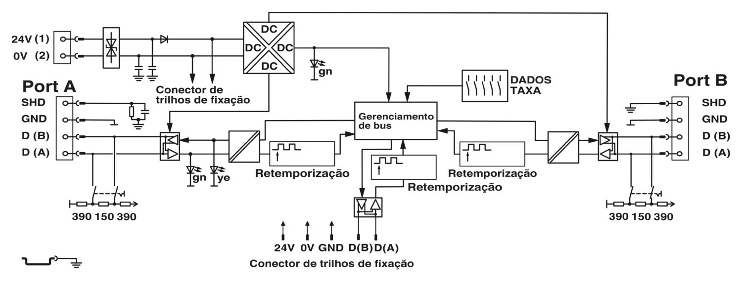 Repetidor modular, para isolação de potencial e aumento de alcance em sistemas Bus RS 485 de 2 condutores até 500 Mbit/s, isolação em 4 vias, montável sobre trilhos, alimentação 24 V DC.