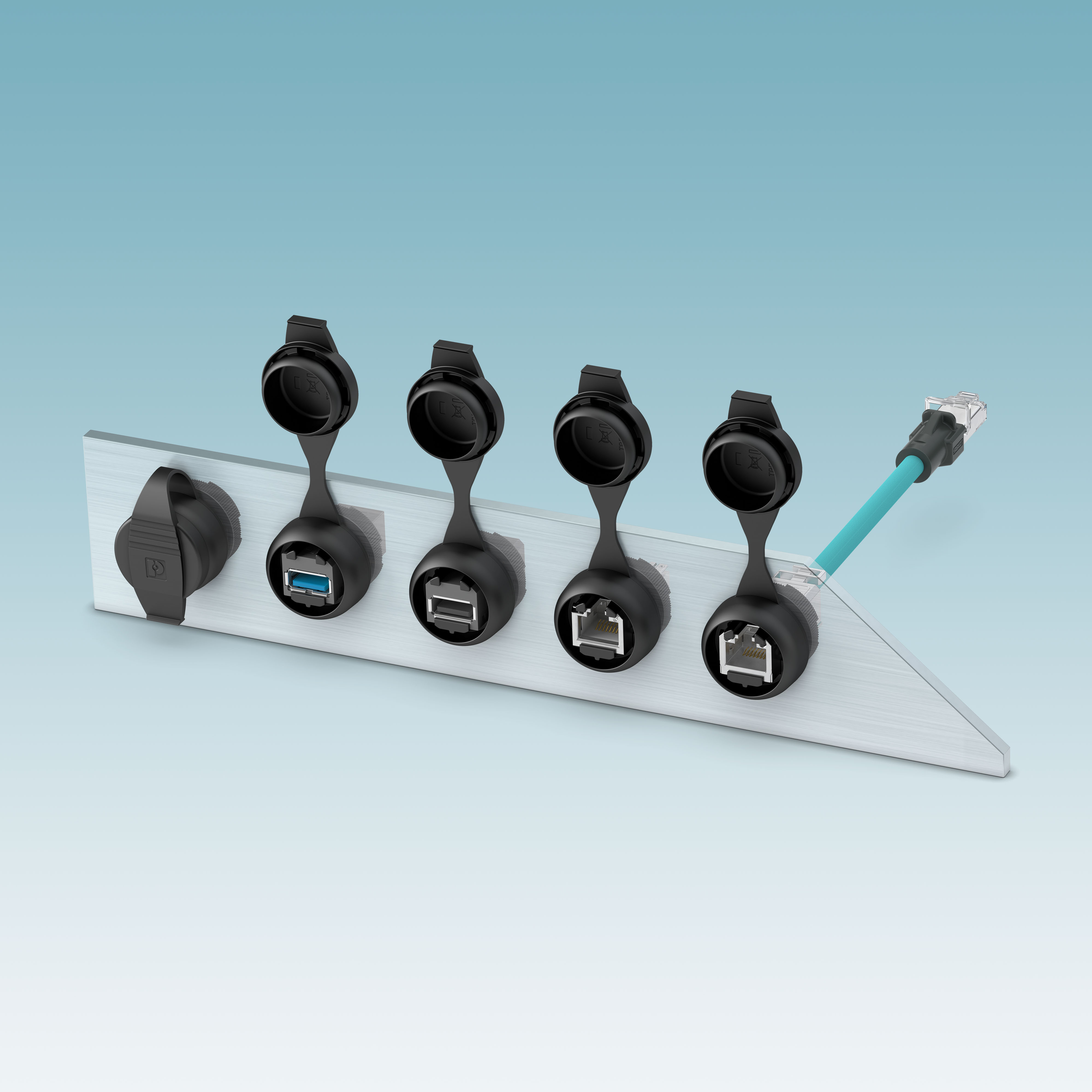 As DSI incluem módulos de acoplamento como USB tipo A 2.0, USB tipo A 3.0 e RJ45 CAT6A, bem como módulos de ligação de cabos na versão RJ45 CAT6A. Graças à classe de proteção IP aumentada de IP65/IP67 com tampa de proteção fechada, as DSI são ideais para uso em ambientes industriais. Permitem a implementação direta, simples e rápida de, p. ex., atualizações e trabalhos de manutenção em quadros de comando e equipamentos fechados, evitando assim longas interrupções do processo. As DSI são adequadas para a montagem frontal com espessuras de parede de 1 a 5 mm. Graças ao recorte de parede padronizado de Ø 22,5 mm, as interfaces permitem uma instalação com economia de espaço. A instalação é feita sem ferramentas e num curto espaço de tempo. Além disso, existe também a possibilidade de individualização com o seu próprio logótipo.