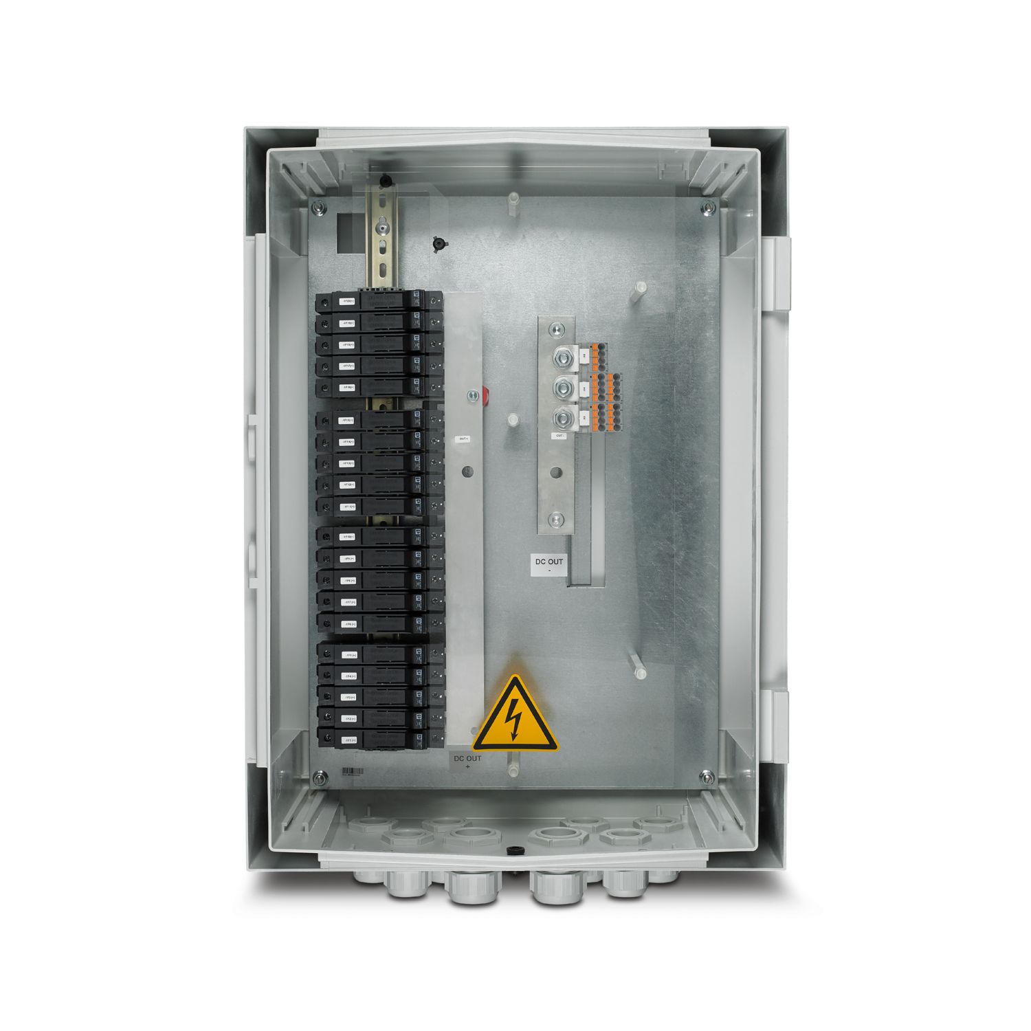 Generatoranslutningsbox för solcellsanläggningar på upp till 1 500 V DC för anslutning av upp till 20 strängar. Med ensidig säkring via säkringshållare. Kabelgenomföring via flera kabelförskruvningar. Inklusive 15 A-säkringsinsatser.