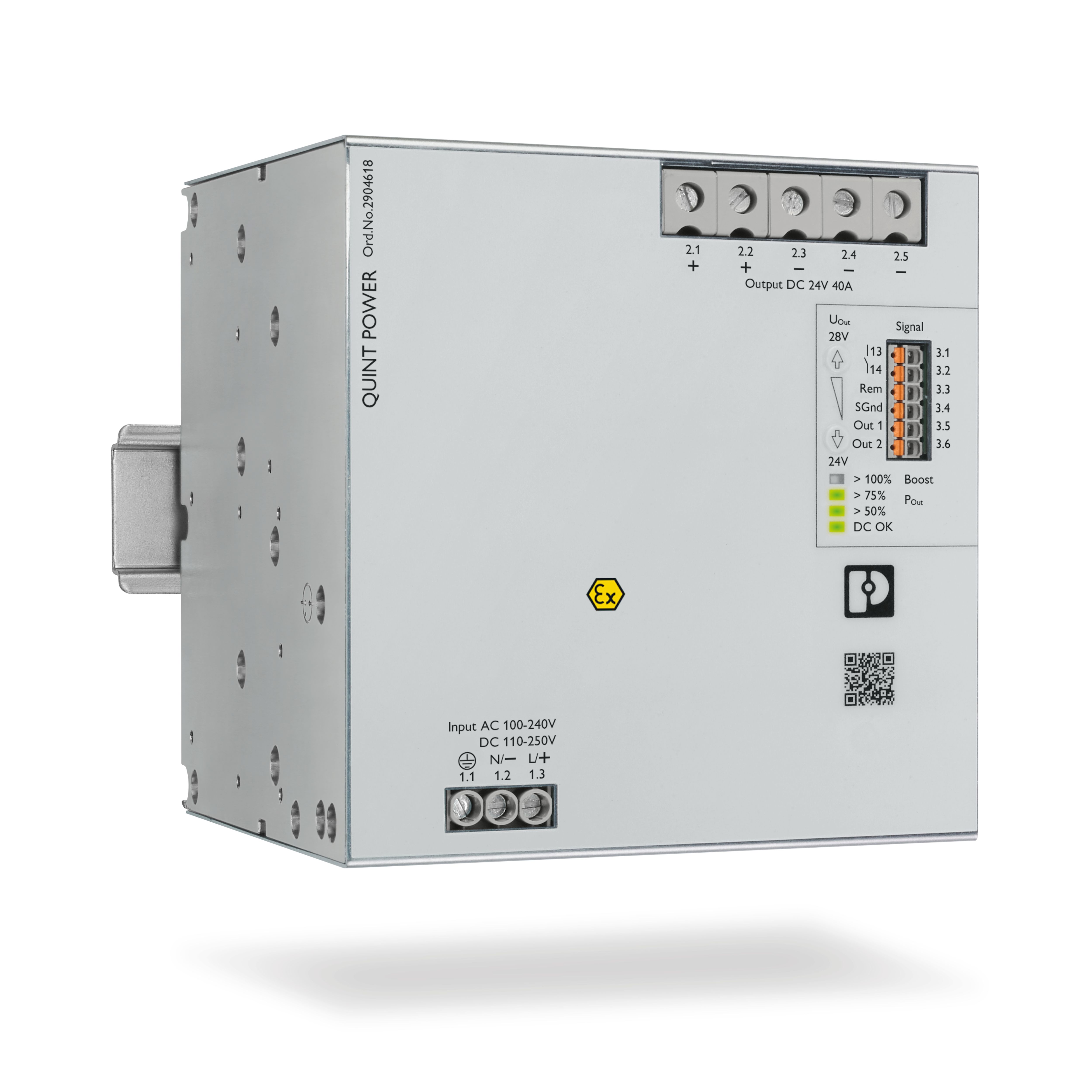 該電源標稱輸出電流為 40 A,具有保護塗漆,獲得了 ATEX 和 IECEx 核准,可用於危險區域(2 區)。內建退耦 MOSFET,電源可以直接並聯,從而提高系統可用性。此外,升級版還獲得了 SIL3 核准,運作可靠性高。QUINT POWER 升級版配有雙重突波保護(OVP,Over Voltage Protection),能夠可靠地保護設備,避免受到電壓升高的影響。發生故障時,相應的輸出將被關閉,以保護負載避免受到突波影響,同時,並聯電源負責安全供電。